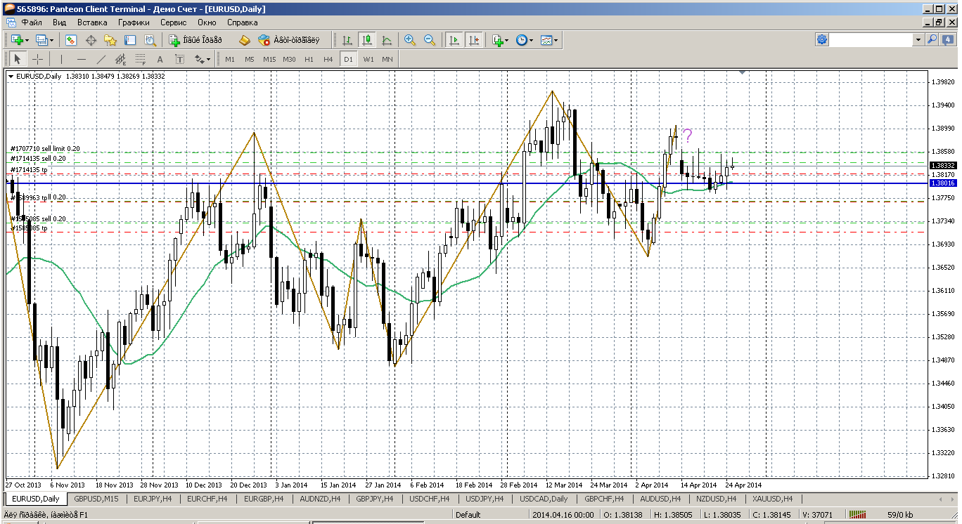Начнем с евры. А можно переносить пост за прошлое воскресенье. Диапазон за неделю 70 пипс. То есть цена по прежнему зажата - сверху зона ГЭПа, снизу дневной мувинг. Если обросить в сторону всякие умозаключения, типа цена высоко....цена дальше не может, то все равно в приоритете получаются покупки. Цена выше мувингов и на дневке и на Н4 и эти мувинги направлены вверх. Поэтому от 1.3825 (тест на Н4) и от 1.3801 (тест на дневке) пару можно покупать. А вот если пробьют, будем новые планы строить Прикрепленные файлы: