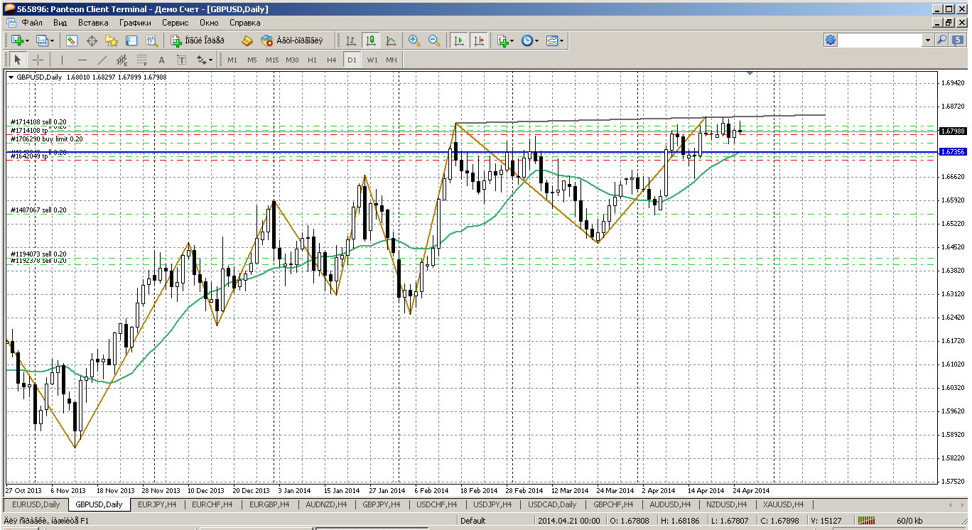 Хоть и установила пара новый годовой хай, но что то на снижение не торопится, как ожидают большинство). И вполне вероятно у пары есть желание обновить этот максимум (интересно, а какой уровень при этом достигнут) и только после этого на снижение. Поэтому, не мудрствуя, любое снижение до 1.6732 (там у нас мувинг расположен) пару покупаем. Если цена закрытия на Н1 будет ниже (а на Н4 еще надежнее) этой цены, то план с покупками отменяем. Прикрепленные файлы: