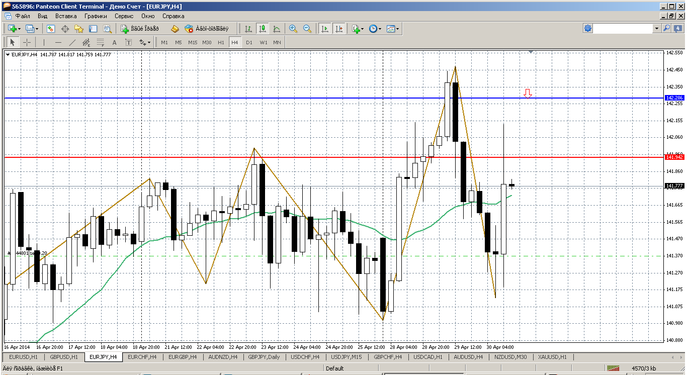 Как то не очень понятно ведет себя эта пара. Цена выше мувингов и на дневном ТФ и на Н4, но не уходит из фигуры 141. Вчера диапазон торгов уложился в 34 пункта, поэтому первые и поддержку и сопротивление вполне логично пропустить. А вот вторые и третье вполне могут быть использованы в работе. Сопротивления 142.22 и 142.41 - от них, понятное дело, продаем...141.51 и 141.36 поддержки, от которых покупки очень обоснованны, особенно от 141.36, там и трендовая создает дополнительный барьер на пути снижения... Прикрепленные файлы: