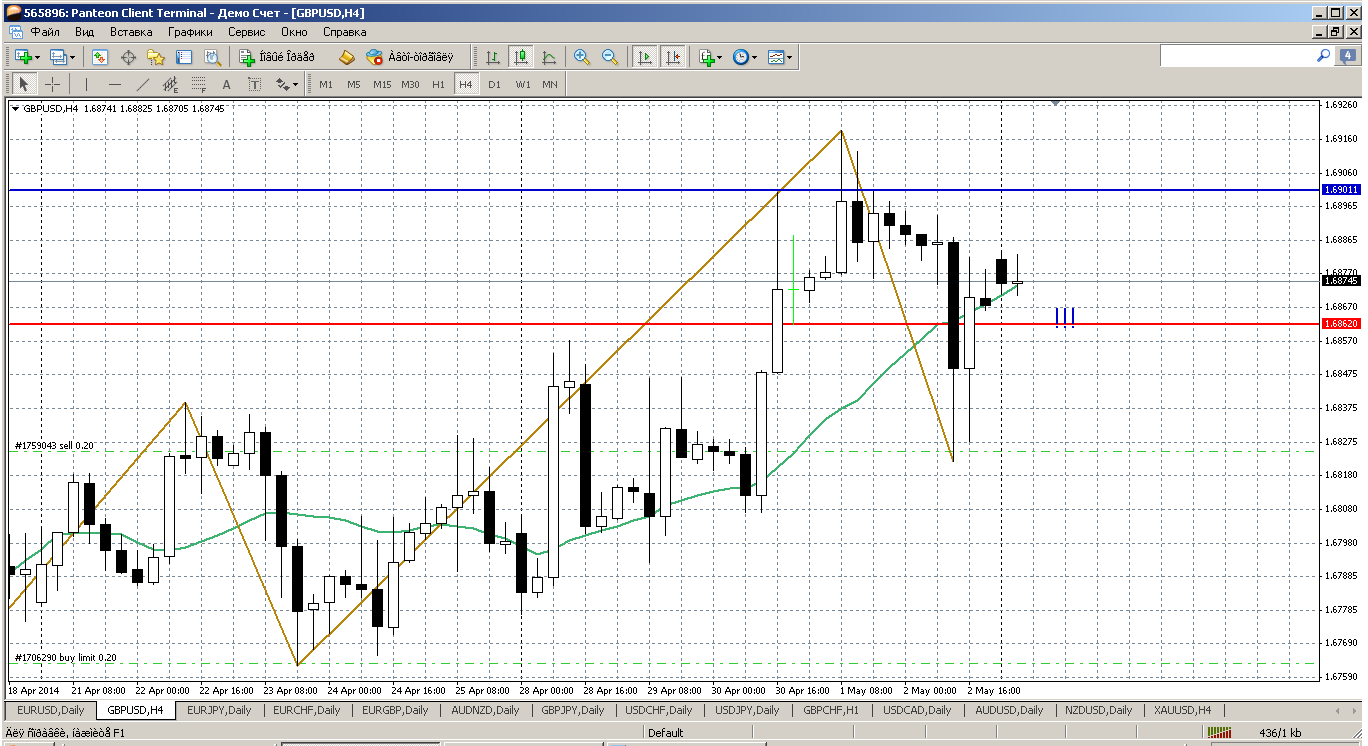 Как то продолжаю искать возможности продавать эту пару. Но ближайшее сопротивление внутри дня 1.6901, а такая цена была бы просто подарком рынка для продаж, но рынок обычно скуп на подарки, поэтому буду ждать пробития уровня 1.6862 (пивот дня) - вот не знаю стоит ли от него покупать??? - но после пробития и технического возврата к нему, попробую продать.... или продать по сигналам меньших ТФ, но их пока нет... Прикрепленные файлы: