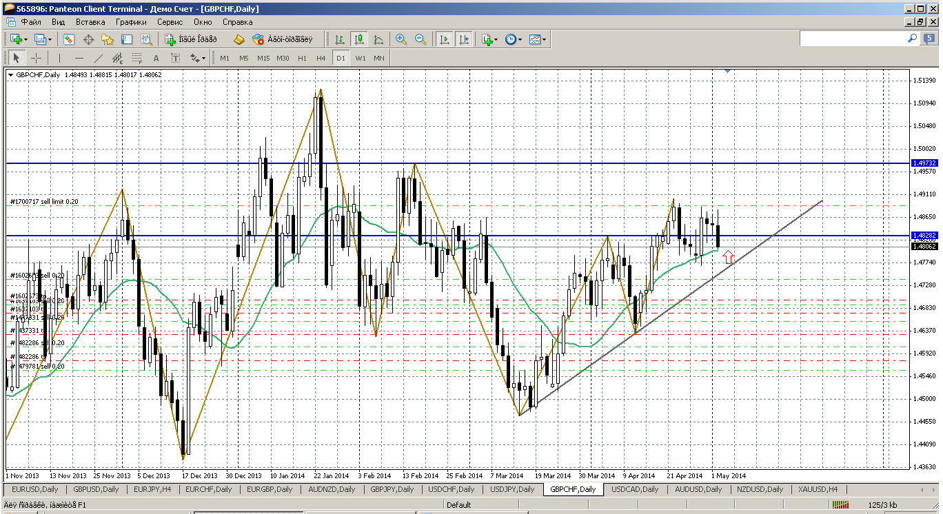 А вот с утра фунт - франк пока вокруг уровня 1.48 топчется и особо не знает куда направиться. Тем более, что это как раз середина между важными внутредневными уровнями. Ближайший сверху - 1.4830 - пивот дня и пока цена вырастит до этого уровня, то и мувинг на Н4 как раз приспустится к этим отметкам, то там и продать можно будет...