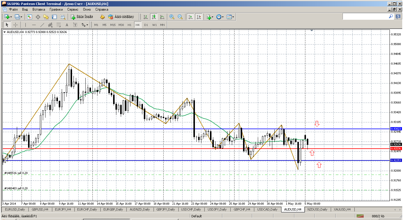 На этом ТФ видим флэт и ничего больше. Как цена пробила и закрепилась ниже дневного мувинга (23 апреля), так и потерялась. Ни тебе технического возврата, ни хода к следующему уровню. Поэтому, думаю, что нужен возврат к уровню 0.9326 (тест мувинга) и уже после этого можно заходить на серьезные продажи. ПС...это картина на дневке, внутри дня ситуация может и отличаться. Прикрепленные файлы: