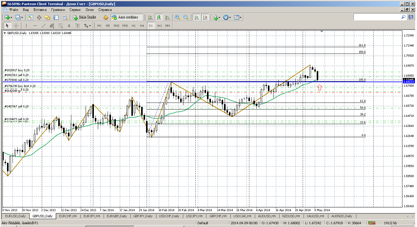 А вот у этой пары дневной график значительно ярче нам показывает вероятность роста цены. И роста не только до 1.70. По фиборасширению вырисовывается чуть выше отметки 1.71. Обоснование такого мнения: цена после установление нового максимума годового, пошла на коррекцию и достигла минимальных уровней, которых вполне может и хватить, чтобы от них оттолкнуться. Это мувинг на дневке. И это предыдущий локальный максимум по зиг-загу. Теперь рост получается вполне обоснованным. Прикрепленные файлы: