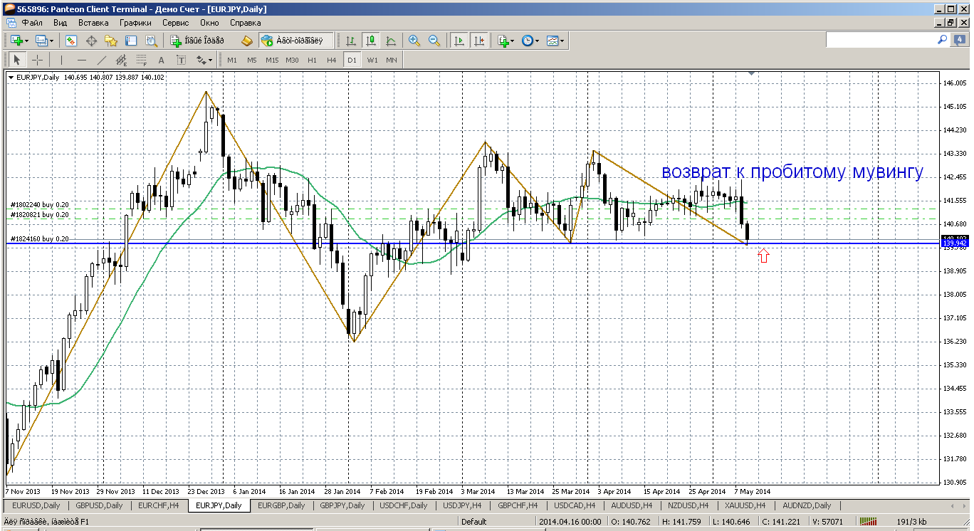 Цена получается вышла из фигуры 141 и вышла в южном направлении. Но можно ли ожидать дальнейшего снижения? Думаю, что нет и есть все основания ожидать с понедельника опять роста и опять движения в фигуру 141. Цена достигла очень серьезного и важного уровня 140, а для евройены это реальный рубикон - то что выше 140 и то что ниже. Да и последняя низинка по зиг-загу на дневке тоже на этом уровне развернулась. Поэтому отскок от этого уровня, думаю будет и хотя бы к мувингу на дневке, но вернуться. Кстати, этот мувинг, не смотря на снижение цены, сохраняет нейтральное положение.... Прикрепленные файлы: