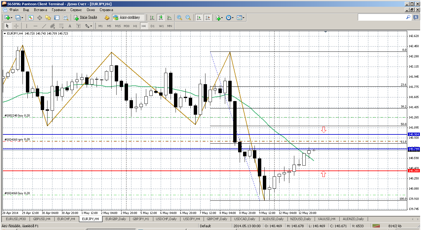 Евро - йена...покупать пару сейчас уже явно не стоит, хотя, понятное дело, могут пойти и к уровню 141. Купим, если вдруг спустится к 140.38 (пивот дня), но это скорее из области фантастики. Сейчас цена тестирует первое сопротивление внутри дня 140.74, но думаю, что пройдут, а вот второе 140.98 - более серьезно сегодня и от него можно попробовать пару продать. Ожидаю возврат к мувингу на Н4. Прикрепленные файлы: