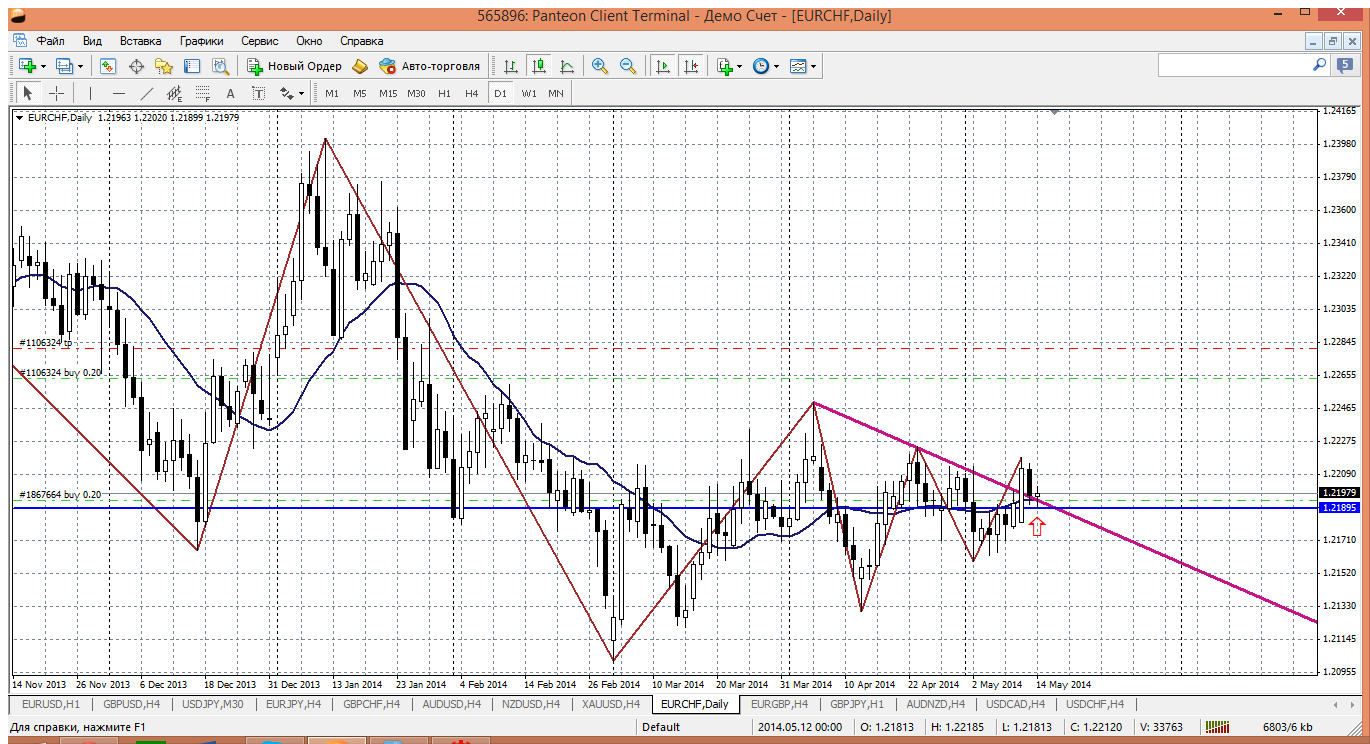 Евро - франк на очереди. Пару эту тоже вверх жду, покупать её надо. Ближайшая поддержка внутри дня 1.2187, но сеть подозрение не пустят туда цену.Уж очень красноречивая ситуация на дневном ТФ. Цена выше трендовой и выше мувинга и эта зона играет роль приличной поддержки, которая не пускает цену ниже. Можно и с текущей цены 1.2197 купить....цели в фигуре 1.22 просматриваются. Прикрепленные файлы: