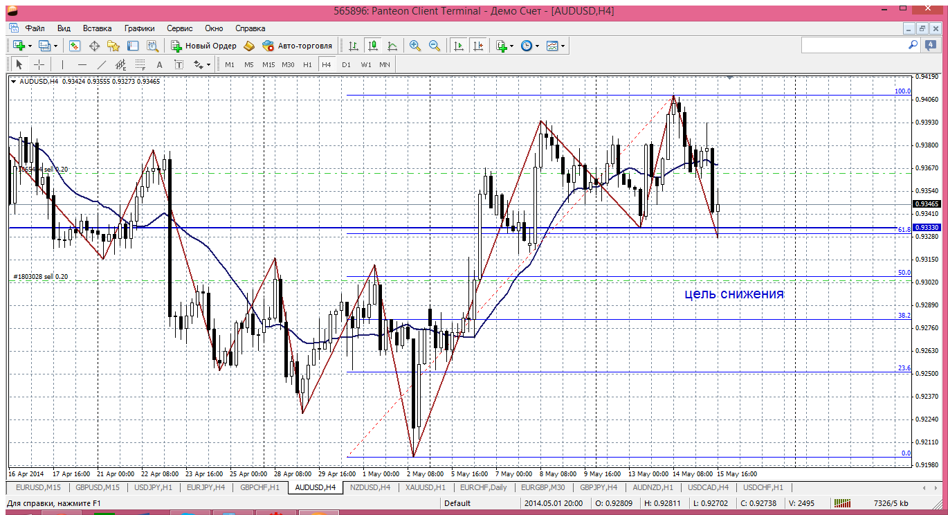Австрлиец....пробил и закрепился ниже мувинга на Н4, но ниже что то идти не хочет. Игнорируя укрепление доллара США против остальных валют. И даже предпринимала несколько попыток пробить его и уйти выше. Думаю, что этот барьер можно использовать. И он (австралиец) все таки должен снизится. Как только цена достигает отметки 0.9367 пару продаем. Пока вот так просто. Прикрепленные файлы: