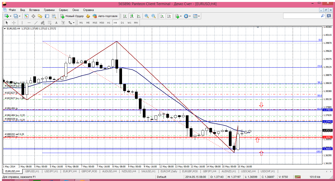 Евра...вчерашний дневной диапазон - 33 пипса. и картина сильно напоминает ситуацию от 12 мая, после чего резкое снижение продолжилось. Сейчас цена вроде как выше уровня пивот 1.3714, там же и мувинг на Н1 расположен, все это сдерживает снижение. Но расти тоже не хотят. И после вчерашнего узкого диапазона сегодня получаются уровни близко друг от друга. Так вот ближайшее сопротивление 1.3731и оно подкреплено мувингом на Н4, тоже приличный барьер для цены. Получается уровни 1.3714 и 1.3731 ключевые на сегодня: куда пробьем - туда и продолжим движение. Ожидаю пока 1.3764 - не выше. Прикрепленные файлы: