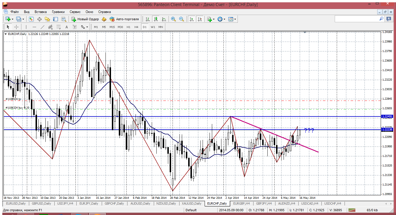 Доллар - франк. Пара протестировала очень важный уровень 0.8952 (последний локальный максимум на дневном ТФ) и если вдруг не продолится майская истерия с ростом бакса, то очень вероятен откат, коррекция. И снижение может получиться довольно глубоким, хоть возврат к пробитому мувингу можно ожидать. Прикрепленные файлы: