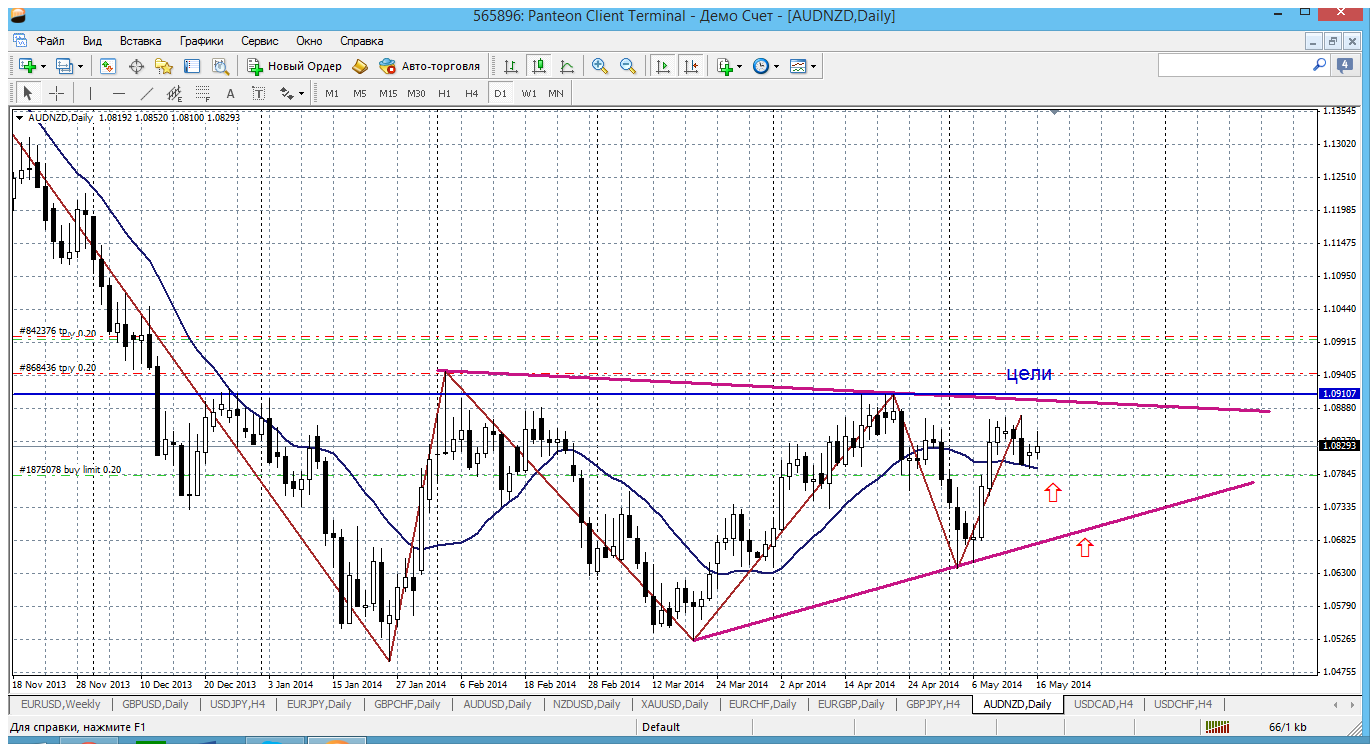 по этой паре у меня получается следующая картина и рассматриваю вот такой вариант развития событий. На дневном ТФ цена закрытия прошлой недели практически повторилась и при закрытии прошедшей. Если по цифрам и есть некоторое расхождение, то по индикатором полное совпадение: закрылись ровно на дневном мувинге. Получается, что отскакивать от мувинга и расти пара уже не хочет (или не может). Получается на предстоящей неделе можно ожидать пробитие мувинга и снижение к 0.8516 (лоу от 29 апреля). Прикрепленные файлы: