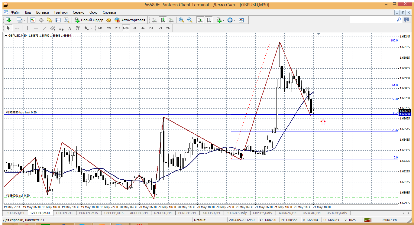 Фунт...здесь и сейчас возникла ситуация, по которой можно открывать покупку фунта по цене 1.6866. Получается что после установления максимума на 1.6920, цена сделала ооочень приличный откат и скорректировалась до уровня по фибо 61.8%, который фунтовые пары очень уважают. Получается покупка от 1.6866 вполне надежна и обоснованна. Думаю, даже если максимум не обновят, еще одну попытку хода к 1.69 предпримут. Прикрепленные файлы: