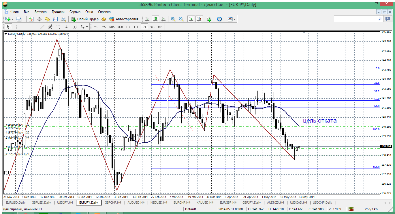 Евро - йена. По этой паре наконец то дождались хоть какого, пускай небольшого, но роста. Сейчас каких то новых уровней на дневке для открытия покупок поблизости нет. Можно указать только цели предстоящего роста (на мой взгляд). 140 (139.96). Это возврат к пробитому уровню, возврат к мувингу на дневке....поэтому внутри дня пробуем искать в первую очередь покупки на предстоящей неделе. Прикрепленные файлы: