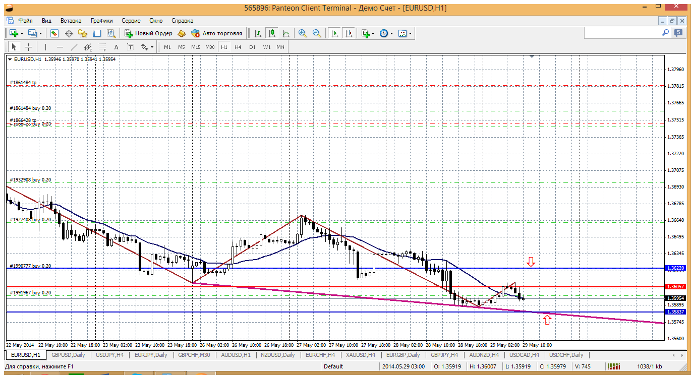 На сегодня снова перед ценой и уровень пивот 1.3662 и мувинг на Н1 - вот и будут вдоль него снижаться. Поддержка ближайшая 1.3638 - минимум от 21 мая. Можно от неё и купить попробовать. А вот от первого сопртивления 1.3680 - не стоит, надежнее от второго 1.3704. У меня так получается.