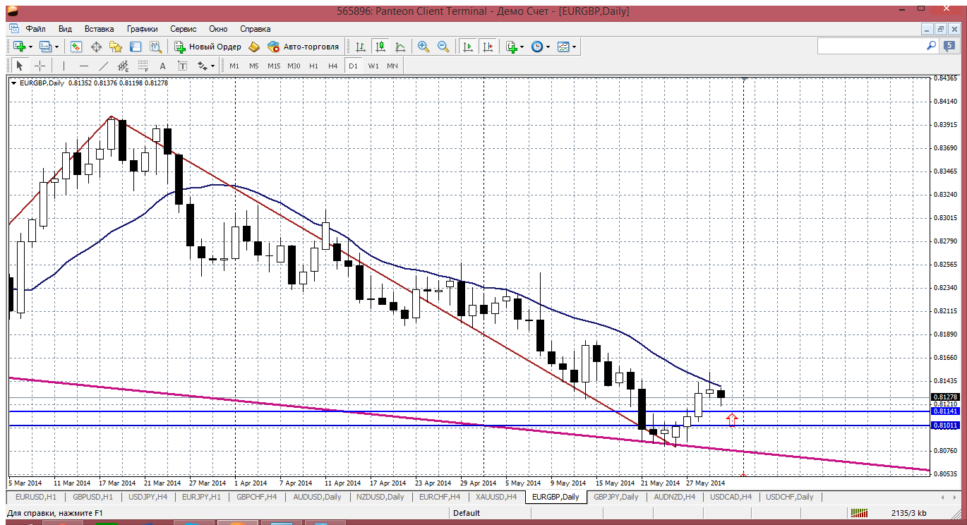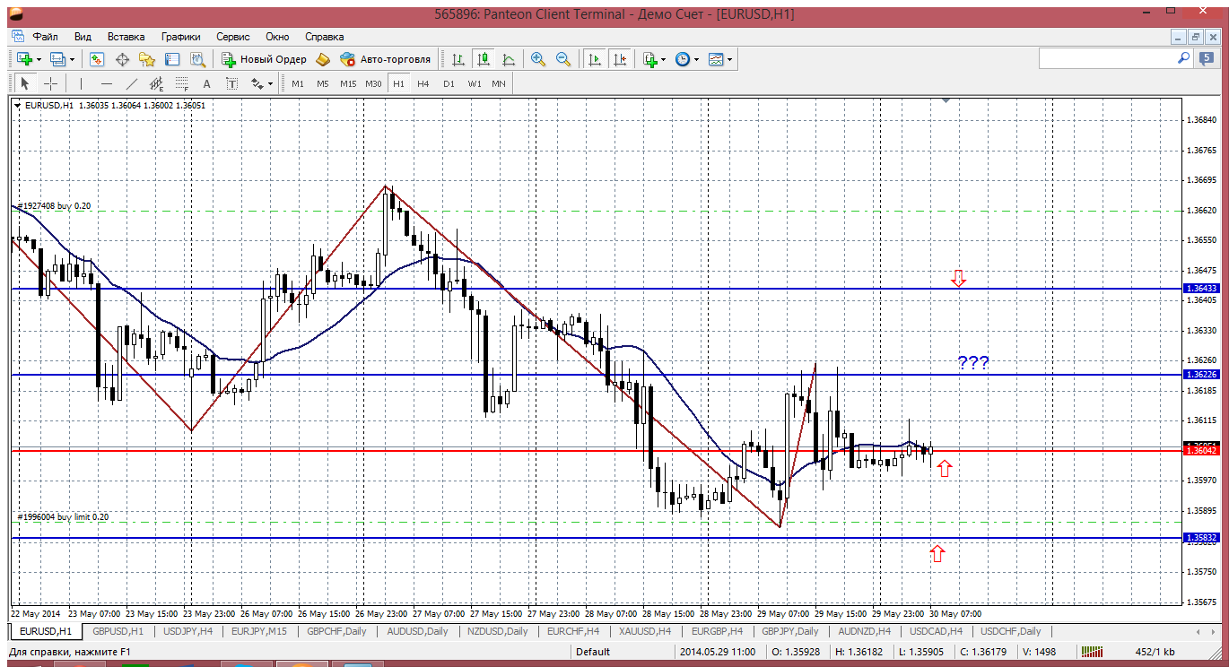 Евра... с началом новой торговой неделе чуток снизилась. Это в рамках коррекции. Цена опустилась к уровню 1.3627 (пивот дня), там же у нас и мувинг на Н1 проходит. То получается, что покупать по этойцене вполне обоснованно и перспективно. Конечно, поддержка 1.3604 надежнее, но как то выглядит она недосягаемой что ли... Продажи...внутри дня можно и от 1.3656 (первое сопротивление) и 1.3679 - второе. Но я бы попробовал продать между ними - от 1.3668 - последний пик на евре от 27 мая. Прикрепленные файлы:
