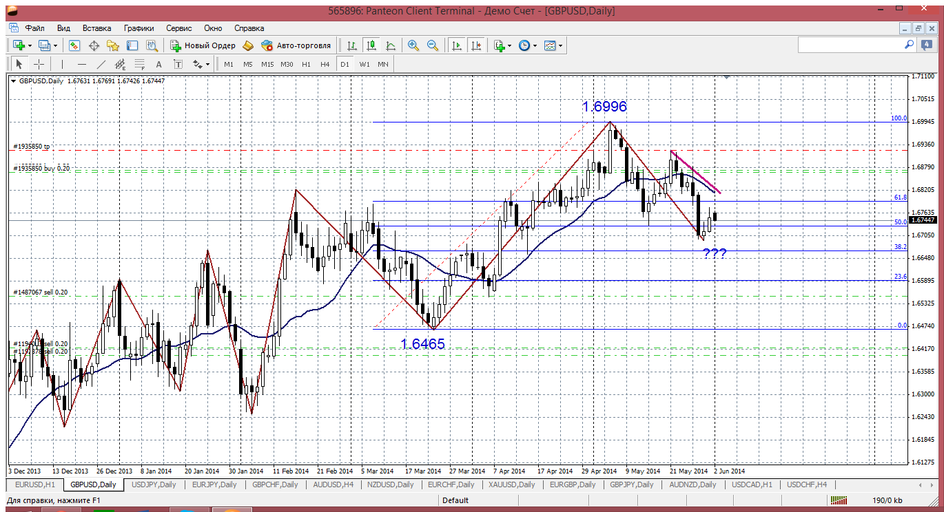 Дневной ТФ. Пара явно выглядит пободрее евры и особых поводов говорить о предстоящем снижении пары я не вижу. Не та картина (хотя рынок может любую картину переломить). Так вот на дневке фунт технично откорректировался только до уровня 50% по фибо (хотя любит обычно 61.8) и возобновил рост. Я, как обычно не буду указывать запредельные цели (пипсов на 300-400), а укажу вполне реально - 1.6820-1.6830. Это те отметки, которые вполне обоснованно цена может достигнуть. А там, скорее всего притормозит, ведь и мувинг дневной и трендовая на Н4, естественно попытаются сдержать рост. Пока так. Прикрепленные файлы: