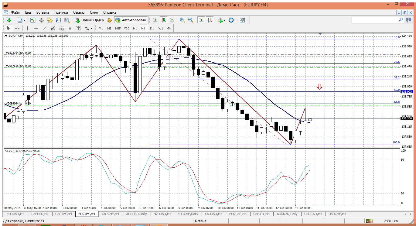 Ну а эта красавица, хоть и без бакса, но пошла вниз за евробаксом (не ожидал, если честно). и она, родимая повелась на распродажи евробакса и уже целых два дня пробивает на своем падении все что только можно и трендовые ....и мувинги...ничто не может даже притормозить падение, не то что развернуть. Сейчас подошли к приличному уровню 138.58, но вторая расчетная поддержка 138.22, но стохастик очень красноречиво рисует возможность роста. Посему не ждем 138.22, а можно купить с текущих. Жду возврата хотя бы к 139 Прикрепленные файлы: