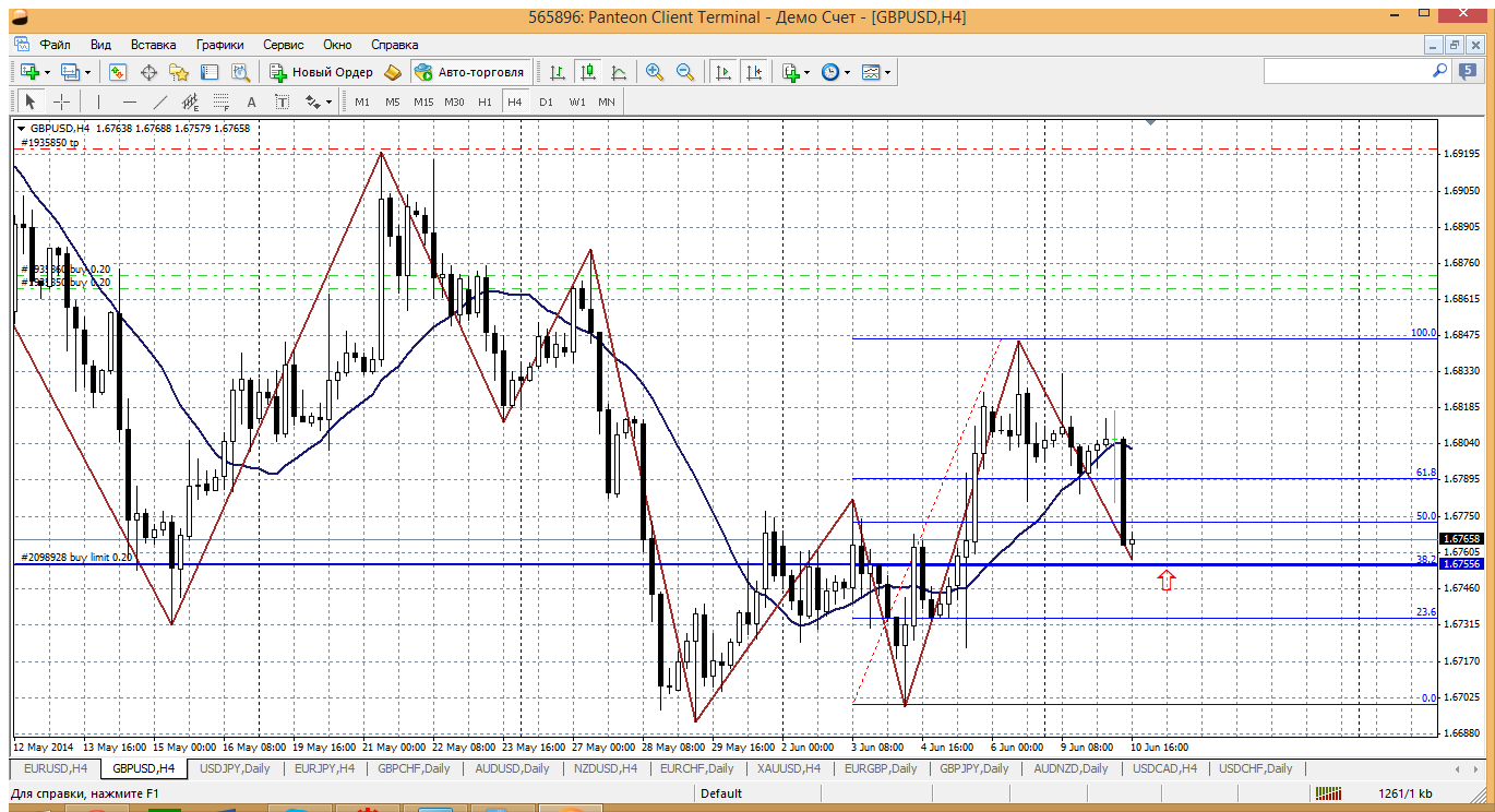А тоже пара не выдерживает укрепление бакса и пока снижается вслед за еврой (хотя утром еще и в фигуру 1.68 сходила). Но пока все в пределах допустимого отката, если глядеть на Н4, то видно что цена подходит к уровню 61.8% отката по фибо, а это 1.6756, и тут же расчетная поддержка внутри дня (вторая) 1.6758....считаю вполне обоснованными покупки из указанного района. Прикрепленные файлы: