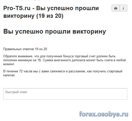 На данный момент нашей компанией Forex-Market предоставляется 3 бонуса всем трейдерам успешно прошедшим викторину на сайте Pro-ts.ru