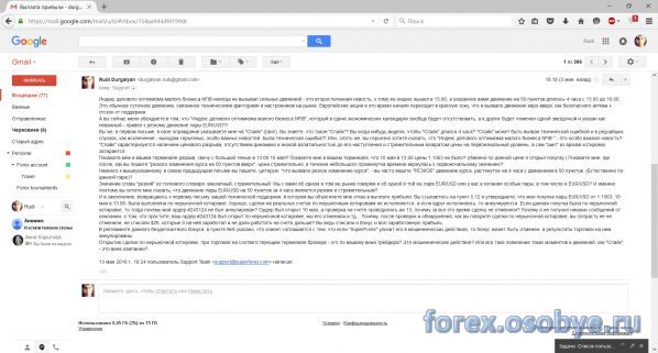 Мало того, что 10 мая в это время никаких важных новостей не выходило, не было никаких сильных движений, уж тем более никаких шипов, даже на их графике, так они еще ссылаются на открыт ордер (который они проверяли и указали в письме) которого вообще нет в моей истории сделок на данном счете.