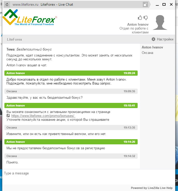 Как у лайта бонус получить? муть какая то А вы вообще говорите о бездепозитном бонусе? Так его там вообще нет. Там присутствует только бонус на пополнение от 100 долл., за привод друга и парочка еще ни о чем. Вот скрин общения с оператором: Прикрепленные файлы: