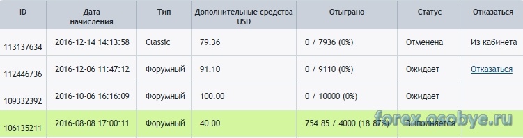 А вот про форумные бонусы Робо Вы знаете далеко не все. Можно, конечно, как Вы высказались, по 20-30 центов писать за пост ... Но это совсем не обязательно. У Форума столько разнообразных конкурсов, включая ежедневный конкурс прогнозов, что и перечислить трудно, потому как постоянно добавляется что-то новое. Вознаграждение за них также попадает на форумный счет, а оттуда раз в месяц - на торговый счет. Но есть одно НО: по сравнению с Welcom Bonus’ом, который можно получить единожды, форумные бонусы можно получать хоть ежемесячно и накапливать их на торговом счете (они, знаете, один другому не мешают :joke: ). Никто не запрещает за определенное время насобирать таким образом 100, 200 ... да хоть 1500 бонусов и торговать на них в свое удовольствие. Напомню - для вывода профита отработка самих бонусов не обязательна.
