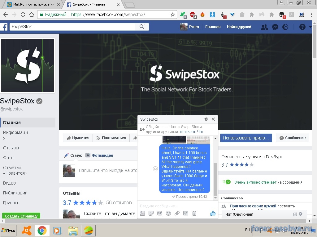 SwipeStox обнулили баланс Я когда это читаю то удивления не вызывает.Просто у Вас сейчас это произошло. Писал что дальше будет пару страниц назад Теперь ожидайте, что и в кабинет закроют доступ.Хоть и попытка восстановления пароля будет доступна.Поддержка молчит .Во всяком случае я не получил ответа по раблокировке. Очень плохо ,что нет нигде представителей на популярных форумах с темами этой компании.Казалось бы мало мальски порой стремящиеся продвинуть свою компанию веду темы и разъясняют все и вся о своей компании , а здесь тухло все. Как вариант может просто лишь просто SwipeStox хочется в эту соцсеть форекс привлекти как можно больше юзеров.Вот и придумали акцию.Ибо кто так ,неизвестно где станет регится.Люди сами выбирают где им удобно общатся и тд..А так с акцией народ сам массово пришел. Так что вопросов куда больше чем ответов. Да и скажите ,те у кого обнулили баланс.Вам документы они одобрили по верификации перед обнулением ??? Если да, и обнулили то это выглядит просто как кидалово.Не больше и не меньше. Документы не верифицировали. Отправлял сканы документов на три адресата, ни один не ответил. Отправил письмо с вопросом почему обнулили счет на три адресата: https://www.facebook.com/swipestox/, ben@swipestox.com и support@swipestox.com. Текст письма на английском и русском языке "Hello. On the balance sheet, I had a $ 100 bonus and $ 91.41 that I haggled. All the money was gone. What happened? Здравствуйте. На балансе у меня было 100$ бонус и 91.41$ то что я наторговал. Эти деньги исчезли. Что случилось?", к письму приложил скрины. Жду ответа, а пока напишу о них негативные отзывы, что бы поисковики проиндексировали это все и в интернете выдавал мои отрицательные отзывы. ![]() Ничто не истинно - всё дозволено! | ||