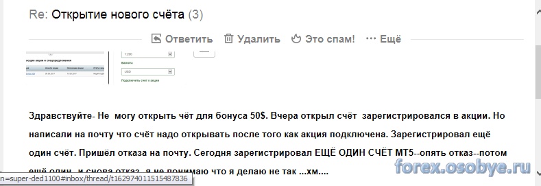Мне тоже 3 раза отклонили и ни каких причин не указывали. Никто не звонил.Сегодня опят хотела открыть еще один счет тоже эту графу --"получить бонус 50$". убрали. Я первый раз тоже не могло получит это бонус и сейчас тоже отклонили. Может быть документы им не понравились Может загран паспорт нужен а у меня нац паспорт. )))Да ладно-не парьтесь-они просто не хотят бонус давать=100%!! Скорее всего слишком много желающих и стрёмно столько раздавать--это э ж тебе не 5$.Вчера им на писал в 14.00 где то, сегодня так и не было ответа. ![]() ![]() | ||