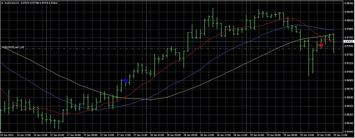 Здравствуйте, нужна ваша помощь. Я выслал вам настроенный индикатор по которому можно уже и сейчас торговать и получать не плохой доход. Но я хочу его немного изменить и автоматизировать. Все дело в том, что к индикатору необходимо добавить ещё один индикатор Moving Average (синяя линия, значение 27) и тогда получится то что на скриншоте,Всё уже не плохо, осталось только изменить , что бы ордер закрывался при пересечении красной и синей линии и всё это автоматизировать. В итоге хотелось бы видеть советника торгуещего по стрелкам. Торгую на Н1.