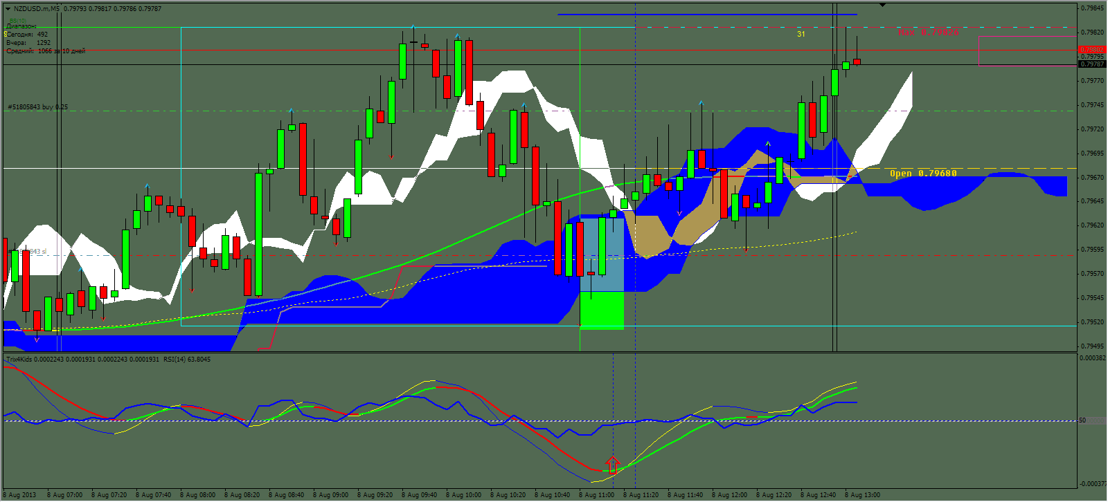 Покупка новозеландца против доллара в четверг .Сигнал после закрытия азиатской сессии .Была разница в показаниях индикатора ватр у разных брокеров но я вошла в покупку со стопом в 15 пунктов и профитом 55 .Сделка закрыта по тейк профит. Прикрепленные файлы: