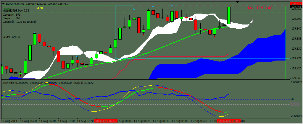 Еще одна покупка за сегодня это евроиена .По ней в торговлм плане была покупка после пробоя уровня 128,90 и 129,55 .Поэтому как только образовался сигнал сразу вошла на евросессии с небольшим стопом и первой целью на сопротивлении 130,55 .Вышла на 130,44 с профитом в 71 пункт. Прикрепленные файлы: