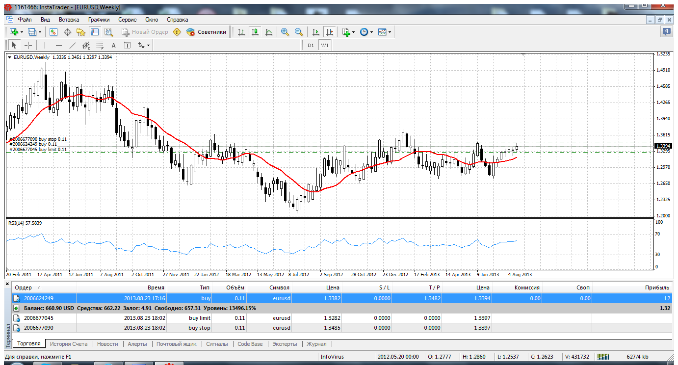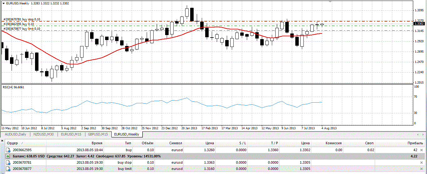 Закрылся ордер на покупку по евро доллару профитом, и по этой же цене сработал бай стоп, с поправкой на спред, теперь на этом ордере я выставил 100 пунктов профит, выше на 3 пункта профита поставил бай стоп, и скорректировал значение бай лимит ордера согласно цене открытия бай ордера. | ||||
