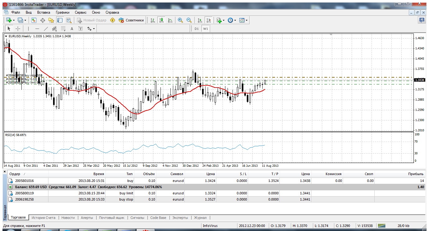 Мы открываем Buy ордер и для того чтоб ускорить выведение данного ордера в без убыток, в случае если цена пойдет против нас, мы используем всю неделю сетку Buy Limit ордеров. Тренд процесс продолжительный, особенно на недельных масштабах, плюс во время тренда коррекции смещаются все дальше и дальше. Во время восходящего смещаются выше, во время нисходящего ниже. Поэтому если мы не будем перестраивать идя за ценой в нашем примере сетку Buy Limit ордеров, то наш ордер будет бесконечно болтаться, не получая тех самых пунктов прибыли, которые мы бы могли получать на откатах (коррекциях) тренда. Допускается открытие одного лимит ордера в сутки, поэтому в день не должно стоять более 1 лимит ордера Прикрепленные файлы: