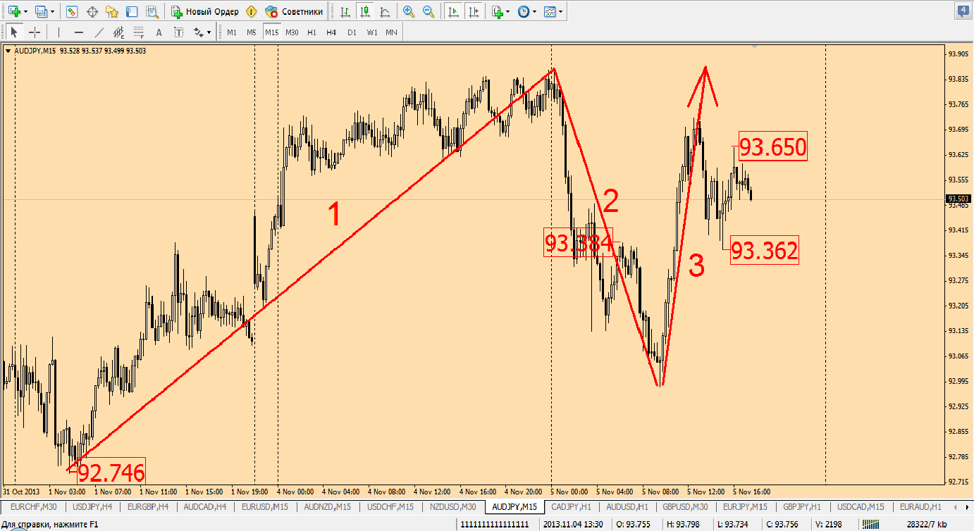 Сейчас на паре тренд определяет волна (1) которая идет от 92.746, побитие максимума 93.348 на данной паре означает окончание коррекционной волны (2) и начало третьей волны вверх, данную пару рассматриваю на покупку в пропития максимума 93.650 и со стопом под минимумом 93.362 и целями до уровня 93.850. А если пара пробивает минимум 93.362 то движение вниз пока пропускаем.