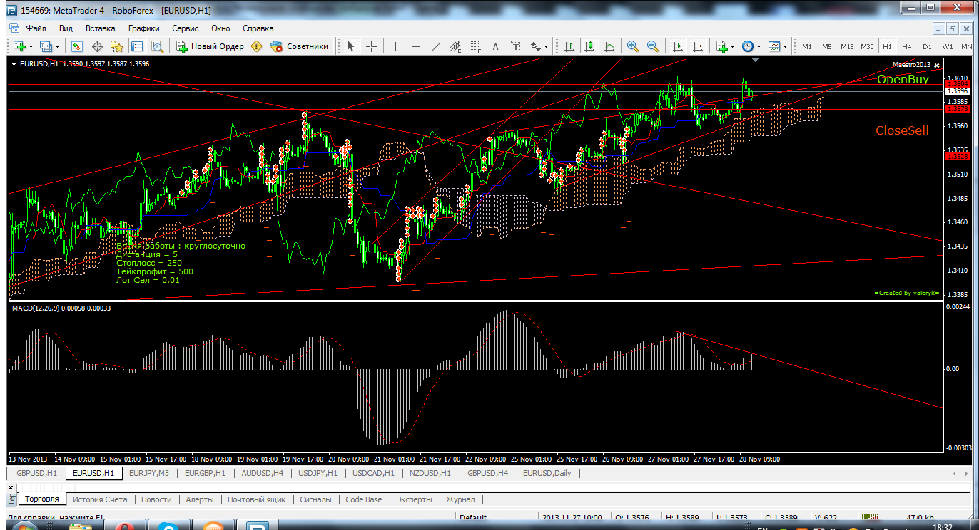 Пример: Пара евро-доллар на данный момент торгуется у сопротивления 1.3604. Пробитие его вверх откроет дорогу к дальнейшему росту пары-очередному сопротивлению 1.3644. На часовом тайм-фрейме по индикатору МАКД сформированна дивергенция. Цена на данный момент зажата между сопротивлением 1.3604 и поддержкой 1.3578 и пробитие одного из уровней откроет дорогу к дальнейшему движению пары. При пробитии поддержки цель для снижения 1.3528-очередная поддержка.