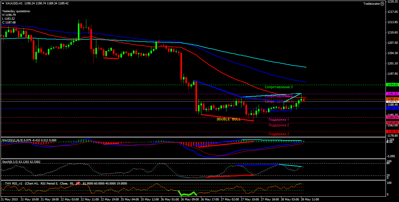 Пара GOLD H1. Индикатор MACD -находится в положительной зоне и поддерживает покупки. Индикатор стохастик -находится между зонами 20-80 и не подаёт чётких сигналов и не подаёт чётких сигналов. Индикатор RSI-так же не подаёт чётких сигналов. Северные цели: сопротивление -1(1191.20), сопротивление-2(1194.03), сопротивление-3(1198.61). Южные цели: поддержка-1(1182.04), поддержка-2(1179.21), поддержка-3(1174.63). Цена торгуется в нисходящем канале,ниже скользящих средних(ЕМА) с периодами (100,200).