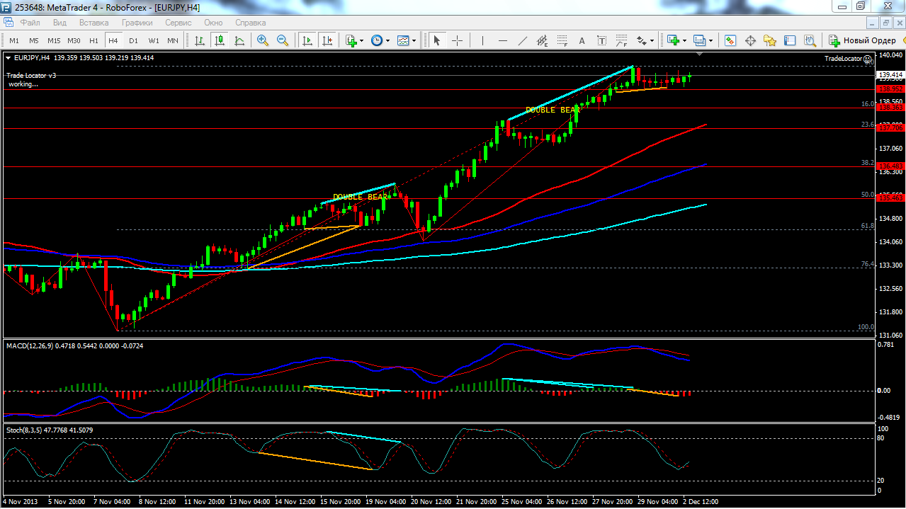 В связи с тем что по паре EUR\JPY торговля ведется выше ЕМА 24.50.100. дополнительный индикатор выше нулевой линии с показанием на повышение а основной индикатор дает сигнал на покупку. судя по показаний на рынке торговлю ведут быки которые продвигают цену на север. по пути следования сильный уровень фрактала и закрепление цены выше этого уровня означает дальнейшее движение на север до уровня 139.63. Прикрепленные файлы: