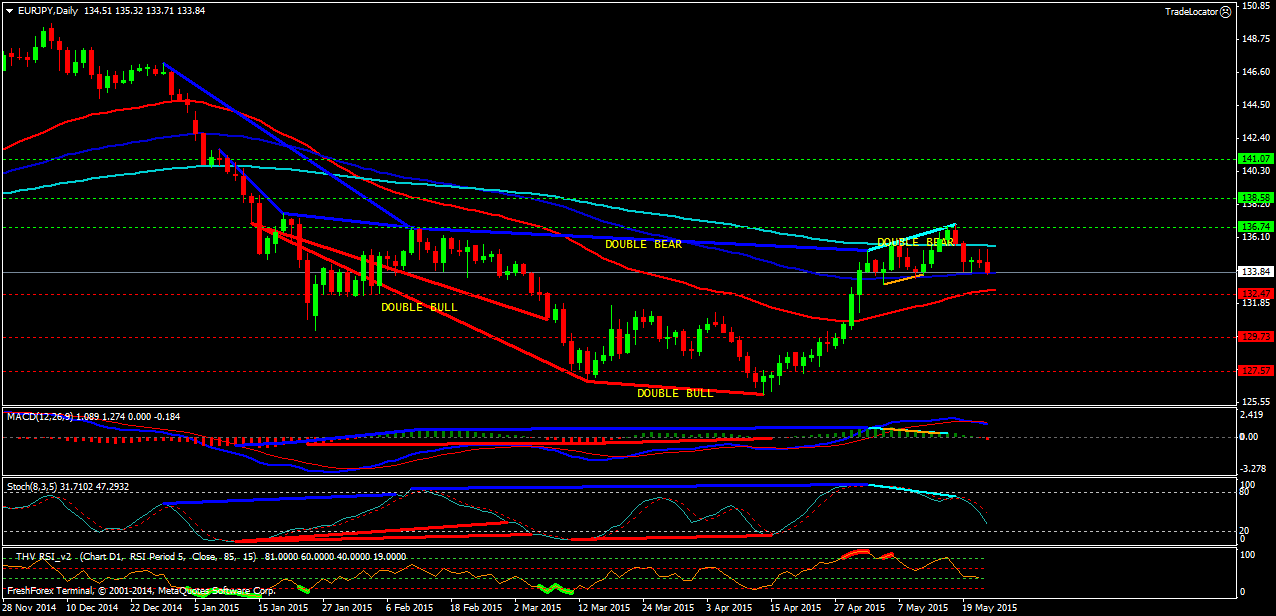 Пара EUR/JPY D1. Индикатор MACD - находится в положительной зоне,но подаёт сигнал на продажу. Индикатор стохастик -направлен к зоне перепроданности и поддерживает продажи. Индикатор RSI-так же поддерживает продажи. Северные цели: сопротивление -1(136.74), сопротивление-2(138.58), сопротивление-3(141.07). Южные цели: поддержка-1(132.47), поддержка-2(129.73), поддержка-3(127.57). Цена торгуется в нисходящем канале,выше скользящих средних(ЕМА) с периодами (50,100).