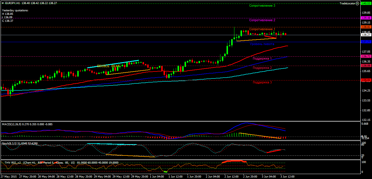 Пара EUR/JPY H1. Индикатор MACD - находится в положительной зоне поддерживает покупки. Индикатор стохастик -находится между зонами 20-80 и не подаёт чётких сигналов. Индикатор RSI-поддерживает покупки. Северные цели: сопротивление -1(138.82), сопротивление-2(139.48), сопротивление-3(140.53). Южные цели: поддержка-1(136.72), поддержка-2(136.06), поддержка-3(135.01). Цена торгуется в восходящем канале,выше скользящих средних(ЕМА) с периодами (50,100,200) и выше пивота.