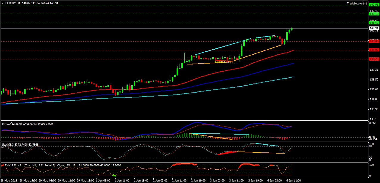 Пара EUR/JPY H1. Индикатор MACD - находится в положительной зоне поддерживает покупки. Индикатор стохастик -направлен к зоне перекупленности так же поддерживает покупки. Индикатор RSI-поддерживает покупки. Северные цели: сопротивление -1(141.40), сопротивление-2(142.19), сопротивление-3(142.98). Южные цели: поддержка-1(139.83), поддержка-2(139.07), поддержка-3(138.29). Цена торгуется в восходящем канале,выше скользящих средних(ЕМА) с периодами (50,100,200).