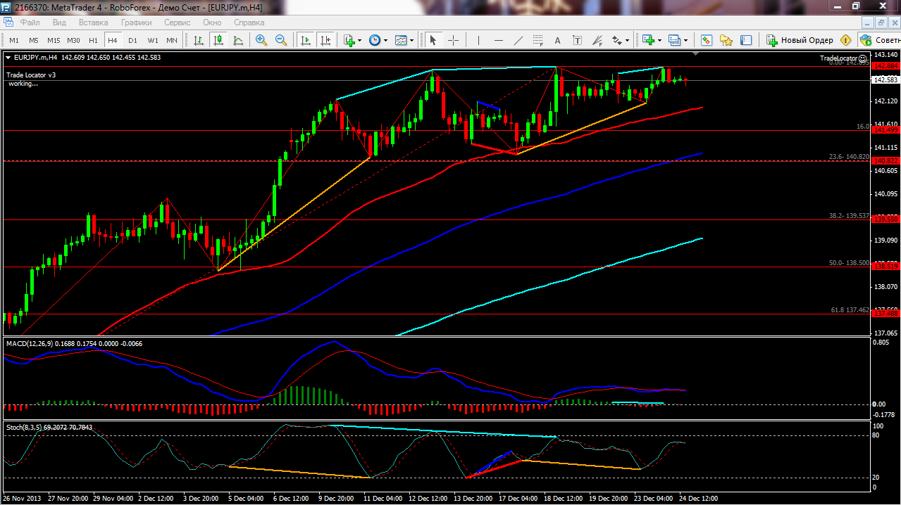 Валютная пара евро иена отскочила от 38% фибо и сформировала канал. Если цена отскакивает от линии поддержки канала + от 23% фибоначчи, вероятно цена продолжит рост к 142.91. После пробоя этого максимума, пара скорее всего продолжит рост. После пробоя линии поддержки канала, рассматриваем продолжение коррекционного движения к 38 или 61% фибо.