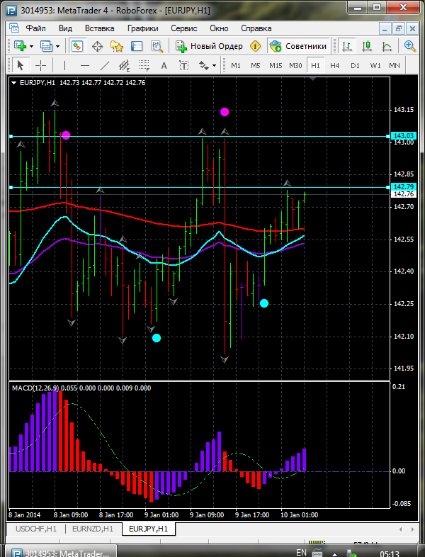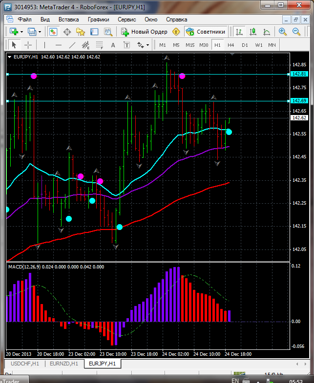 По паре EUR\JPY на данный момент торговля ведется выше ЕМА 100.24.50. дополнительный индикатор выше нулевой линии с показанием на повышение а основной индикатор дает сигнал на покупку. судя по показаний на рынке торговлю ведут быки которые продвигают цену на север. по пути следования сильный уровень фрактала и закрепление цены выше этого уровня означает дальнейшее движение на север до уровня 143.03. Прикрепленные файлы: