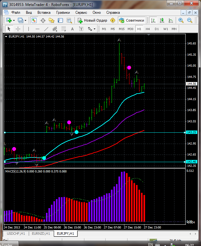 В связи с тем что по паре EUR\JPY торговля закрылась выше ЕМА 24.50.100. дополнительный индикатор выше нулевой линии с показанием на понижение а основной индикатор дает сигнал на продажу. судя по показаний на рынке торговлю ведут медведи которые продвигают цену на юг. по пути следования сильный уровень фрактала и закрепление цены ниже этого уровня означает дальнейшее движение на юг до уровня 142.46. Прикрепленные файлы: