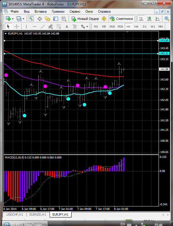 На сегодня по паре EUR\JPY торговля ведется выше ЕМА 24.50.100. дополнительный индикатор выше нулевой линии с показанием на повышение а основной индикатор дает сигнал на покупку. судя по показаний на рынке торговлю ведут быки которые продвигают цену на север. по пути следования сильный уровень фрактала и закрепление цены выше этого уровня означает дальнейшее движение на север до уровня 142.81. Прикрепленные файлы: