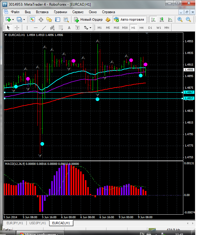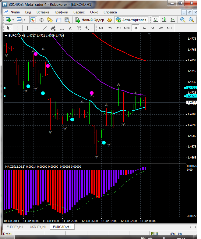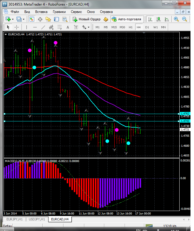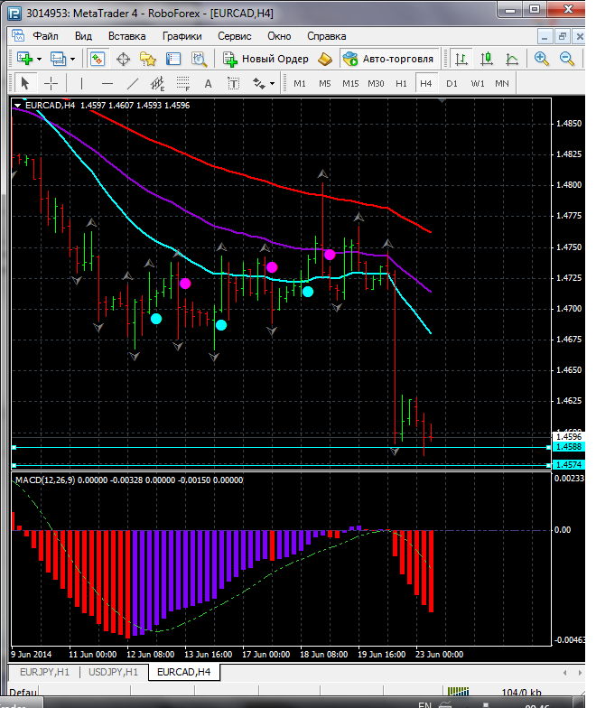 На данный момент по паре EUR\CAD торговля ведется между ЕМА 24.50. дополнительный индикатор выше нулевой линии с показанием на понижение а основной индикатор дает сигнал на продажу. судя по показаний на рынке торговлю ведут медведи которые продвигают цену на юг. по пути следования сильный уровень фрактала и закрепление цены ниже этого уровня означает дальнейшее движение на юг до уровня 1.4857. Прикрепленные файлы: