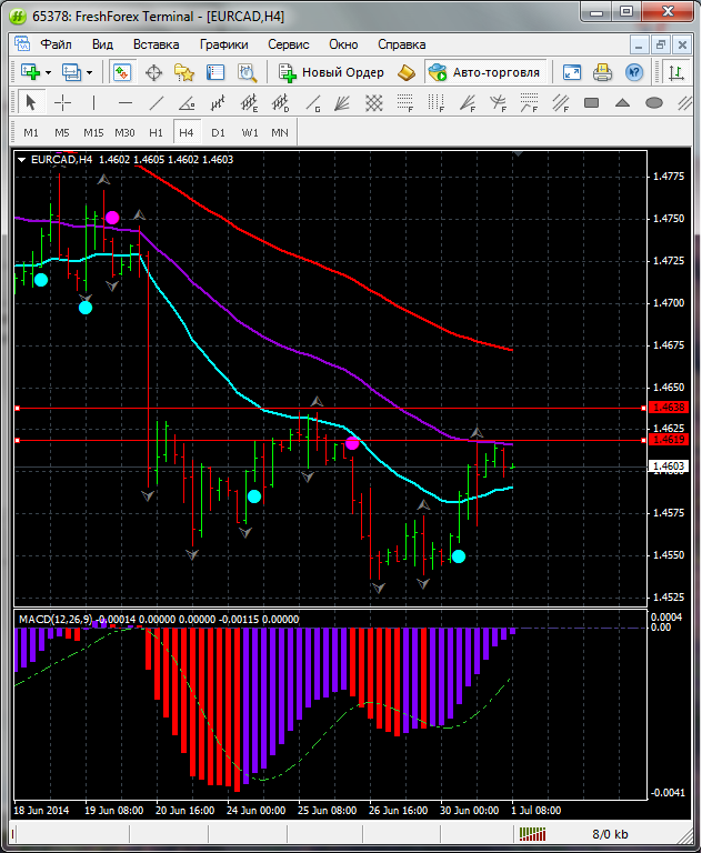 На данный момент по паре EUR\CAD торговля ведется между ЕМА 100.50. дополнительный индикатор выше нулевой линии с показанием на понижение а основной индикатор дает сигнал на продажу. судя по показаний на рынке торговлю ведут медведи которые продвигают цену на юг. по пути следования сильный уровень фрактала и закрепление цены ниже этого уровня означает дальнейшее движение на юг до уровня 1.4556. Прикрепленные файлы: