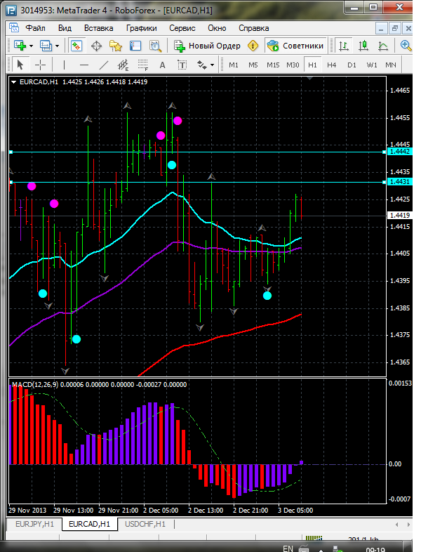 В связи с тем что по паре EUR\CAD торговля закрылась выше ЕМА 24.50.100. дополнительный индикатор выше нулевой линии с показанием на повышение а основной индикатор дает сигнал на покупку. судя по показаний на рынке торговлю ведут быки которые продвигают цену на север. по пути следования сильный уровень фрактала и закрепление цены выше этого уровня означает дальнейшее движение на север до уровня 1.4462. Прикрепленные файлы: