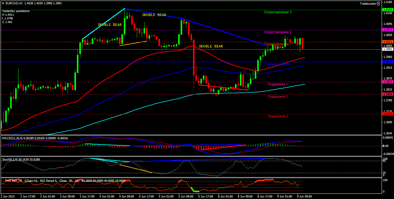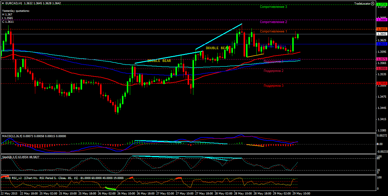 Пара EUR/CAD H1. Индикатор MACD -находится в отрицательной зоне,но подаёт сигнал на покупки. Индикатор стохастик -вышел из зоны перепроданности и так же подаёт сигнал на покупку. Индикатор RSI-поддерживает покупки.Северные цели: сопротивление -1(1.3519), сопротивление-2(1.3580), сопротивление-3(1.3610). Южные цели: поддержка-1(1.3429), поддержка-2(1.3398), поддержка-3(1.3367). Цена торгуется в нисходящем канале,ниже скользящих средних(ЕМА) с периодами (50,100,200).