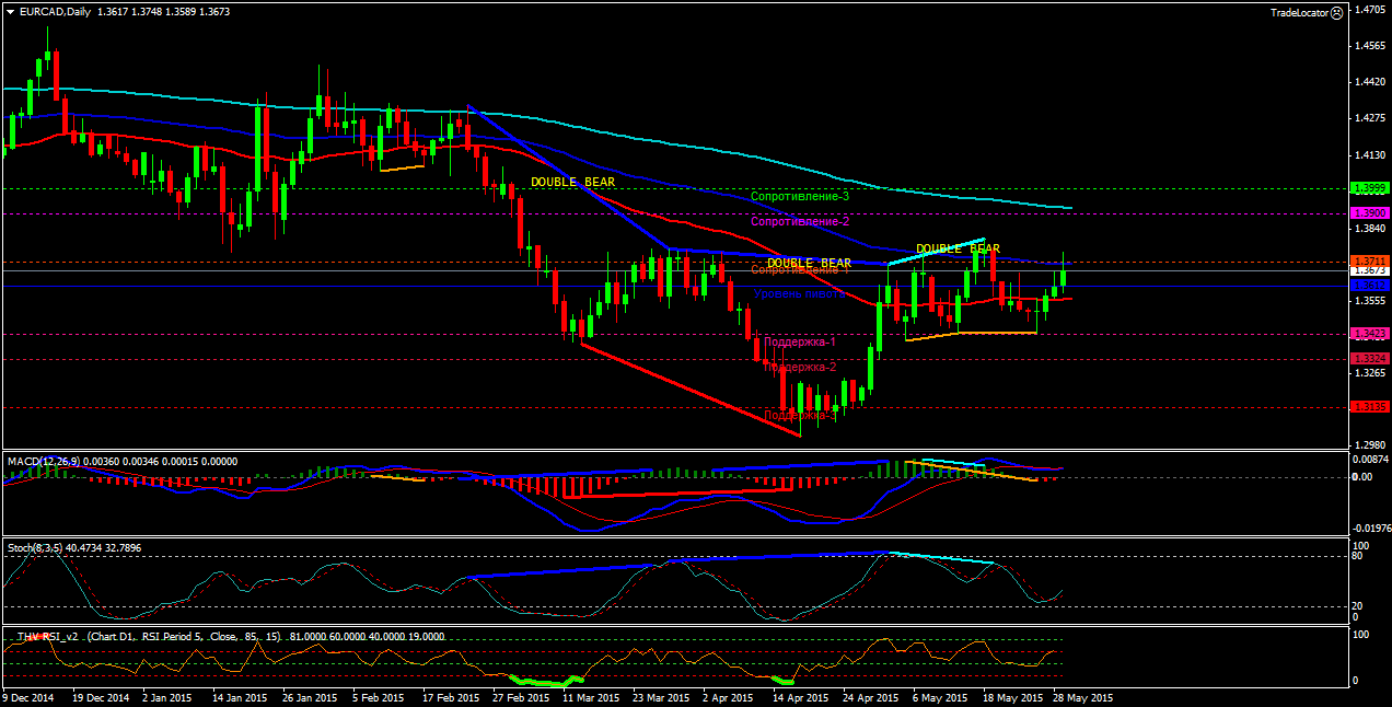 Пара EUR/CAD D1. Индикатор MACD - находится в положительной зоне,но формирует сигнал на продажи. Индикатор стохастик - направлен к зоне перепроданности и подаёт сигнал на продажи. Индикатор RSI-так же поддерживает продажи. Северные цели: сопротивление -1(1.3875), сопротивление-2(1.4000), сопротивление-3(1.4224). Южные цели: поддержка-1(1.3445), поддержка-2(1.3302), поддержка-3(1.3177). Цена торгуется в нисходящем канале,ниже скользящих средних(ЕМА) с периодами (50,100,200) и ниже пивота.