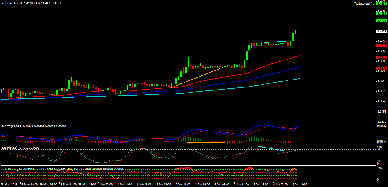 Пара EUR/CAD H1. Индикатор MACD -находится в положительной зоне и поддерживает покупки. Индикатор стохастик -находится возле зоны перекупленности и так же поддерживает покупки. Индикатор RSI-поддерживает покупки. Северные цели: сопротивление -1(1.4221), сопротивление-2(1.4283), сопротивление-3(1.4367). Южные цели: поддержка-1(1.4013), поддержка-2(1.3912), поддержка-3(1.3819). Цена торгуется в восходящем канале,выше скользящих средних(ЕМА) с периодами (50,100,200).