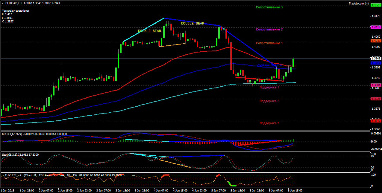 Пара EUR/CAD H1. Индикатор MACD -находится в положительной зоне и поддерживает покупки. Индикатор стохастик -направлен к зоне перекупленности и так же поддерживает покупки. Индикатор RSI-поддерживает покупки. Северные цели: сопротивление -1(1.3896), сопротивление-2(1.3957), сопротивление-3(1.4054). Южные цели: поддержка-1(1.3702), поддержка-2(1.3641), поддержка-3(1.3544). Цена торгуется в восходящем канале,выше скользящих средних(ЕМА) с периодами (50,100,200) и выше пивота.